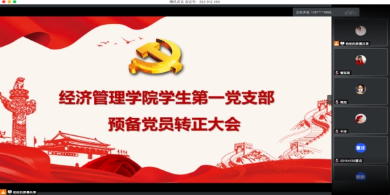 经济管理学院学生第一党支部于2020年6月11日利用腾讯会议软件平台线上召开了预备党员转正大会,讨论、表决通过穆然坤等27名预备党员转正。支部大会由经济管理学院2016级辅导员李智超老师主持召开,经济管理学院学生第一党支部支部书记薛长春及全体党员参加了会议。
