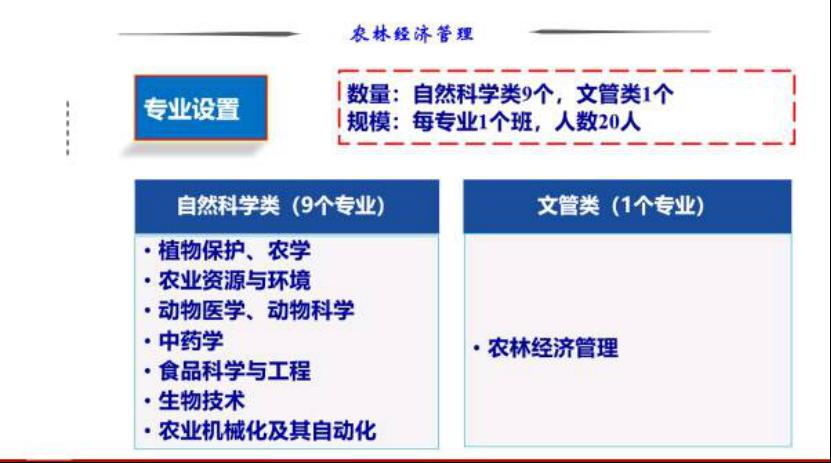 “农林经济创新班”实行个性化教育,因材施教,实现本、硕、博一体化培养。面向行政事业单位、科研院所、大专院校、涉农企业、自主创业等领域,培养德才兼备、视野开阔、善于创新、具备较强的农林经济管理理论知识和实践能力、能够适应经济社会发展的领军人才。
