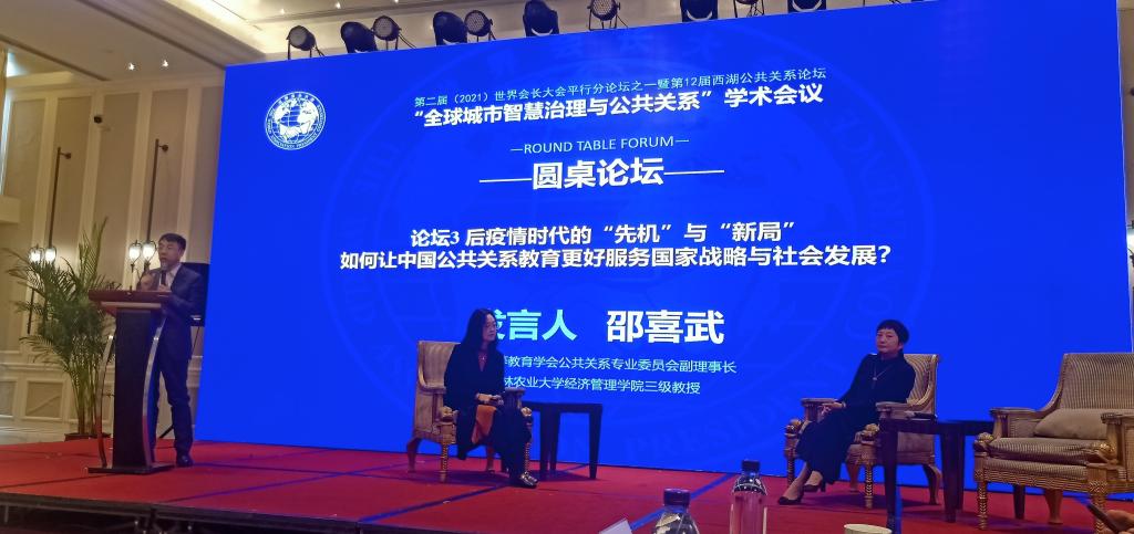 近日,中国高等教育学会公共关系教育专业委员会第六次会员代表大会暨“全球城市智慧治理与公共关系”学术年会在杭州市成功举办。经济管理学院邵喜武教授在换届选举中当选副理事长,在大会上做了题为《后疫情时代中国公关教育的破旧与立新》的报告,大会报告得到了与会专家、领导的高度评价。