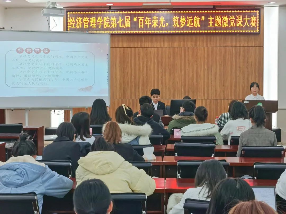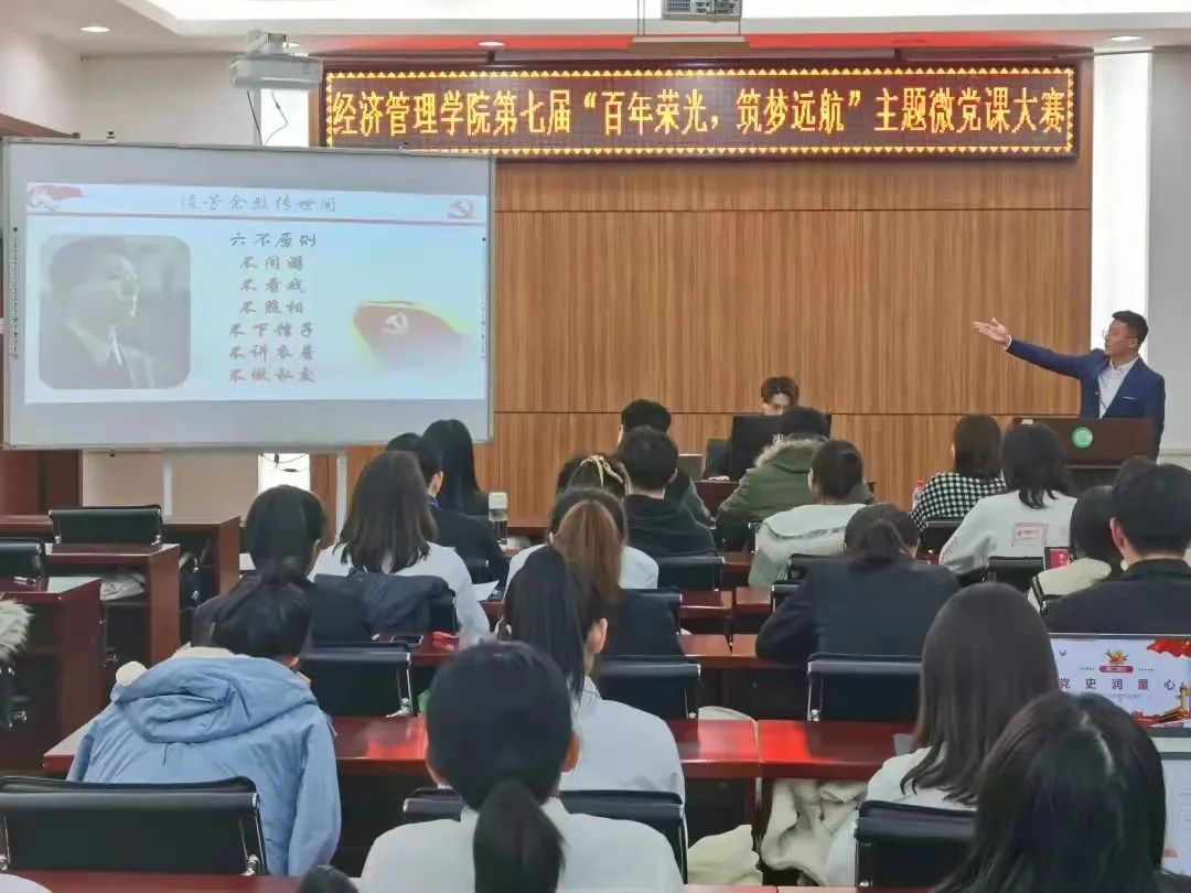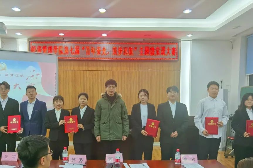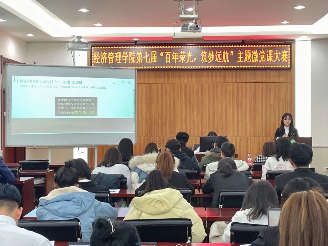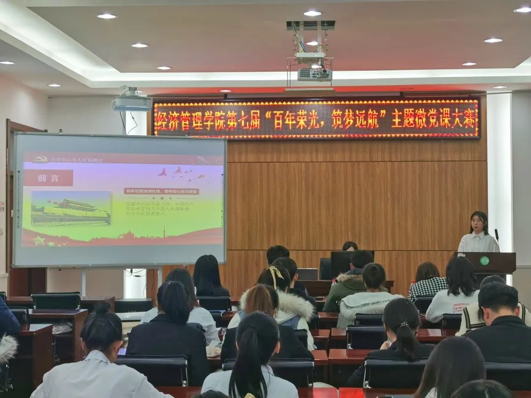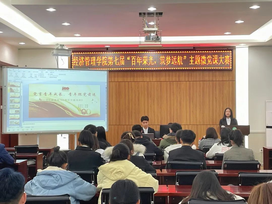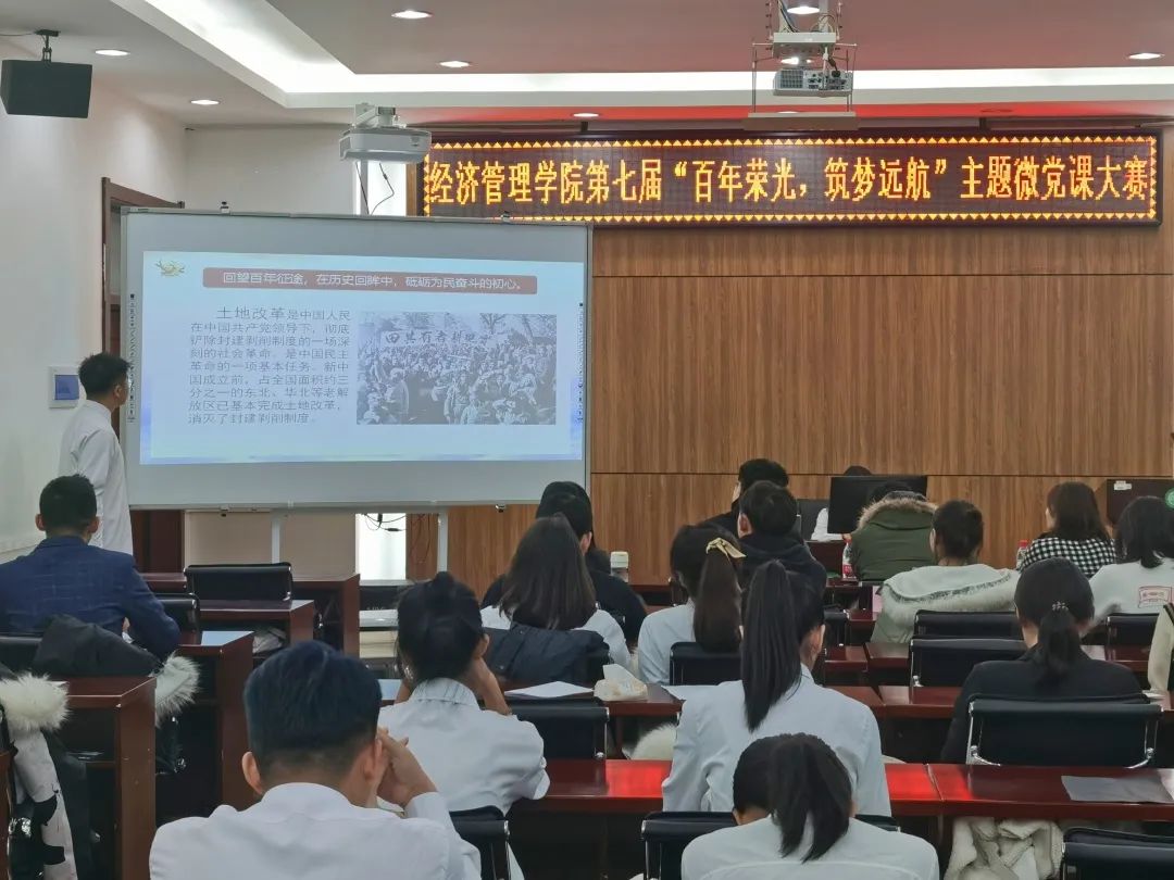 为庆祝中国共产党建党100周年,提升青年学子的政治素质和党性修养,加深学生对中国共产党的认识,落实学校党委主题教育活动的各项方案,经济管理学院第五届新时代特色理论研习社于2021年11月8日在社科楼527室举办了“百年荣光,逐梦远航”主题微党课大赛。