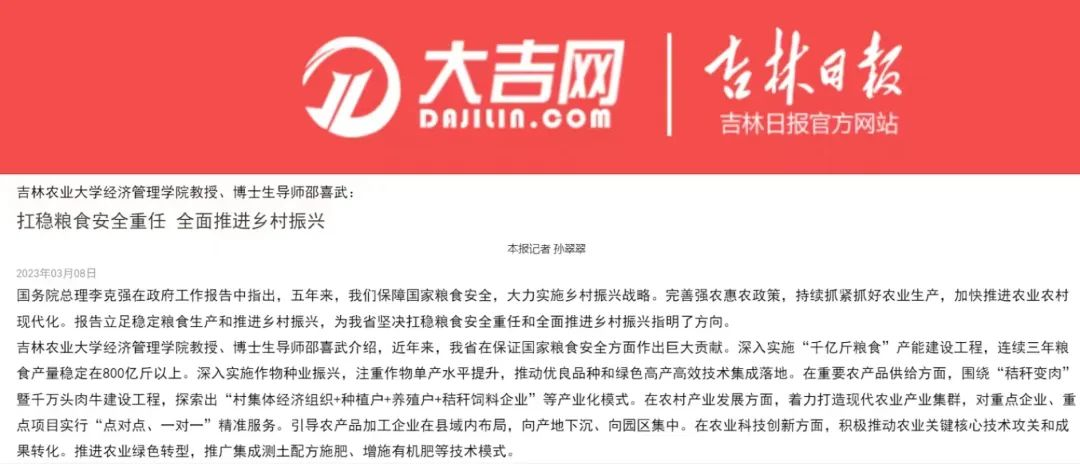 3月9日,吉林日报以《吉林农业大学经济管理学院教授、博士生导师邵喜武:扛稳粮食安全重任 全面推进乡村振兴》为题,对我院经济管理学院教授、博士生导师邵喜武进行了采访报道。
