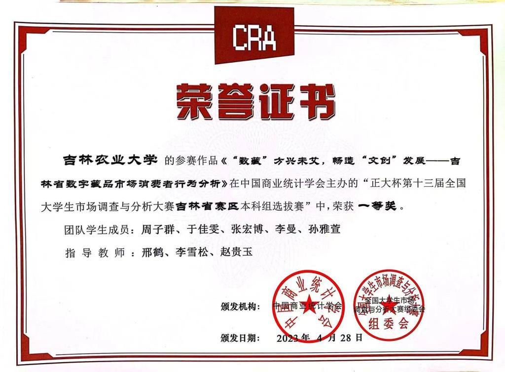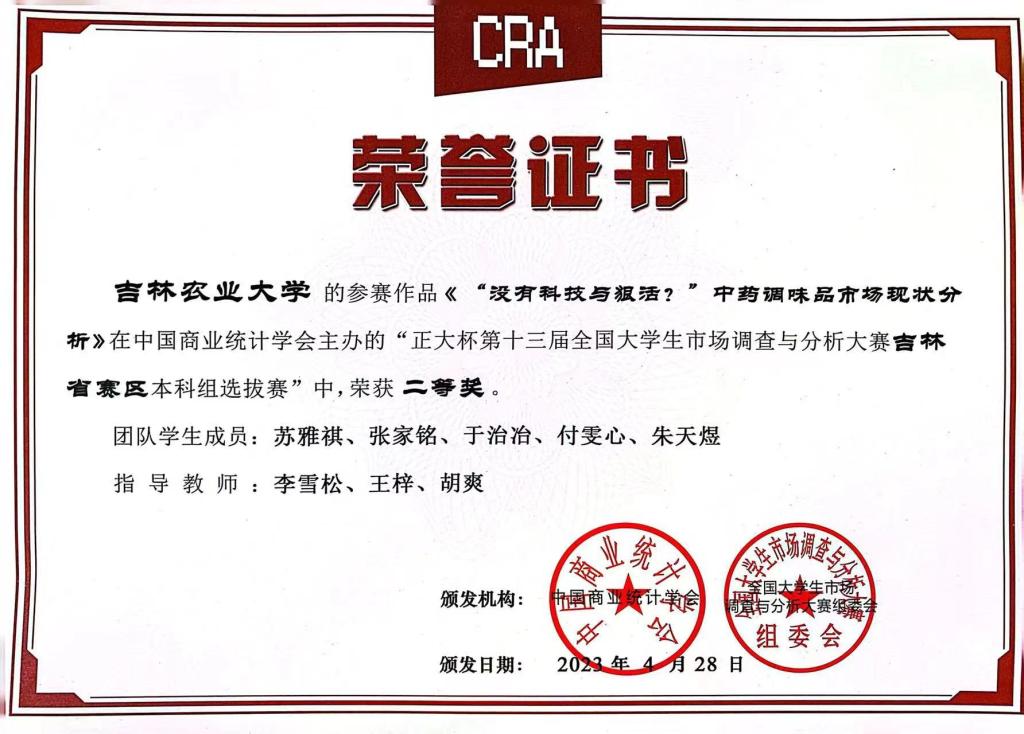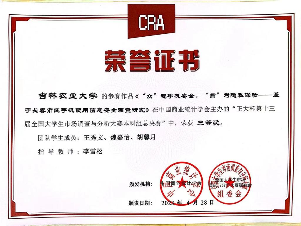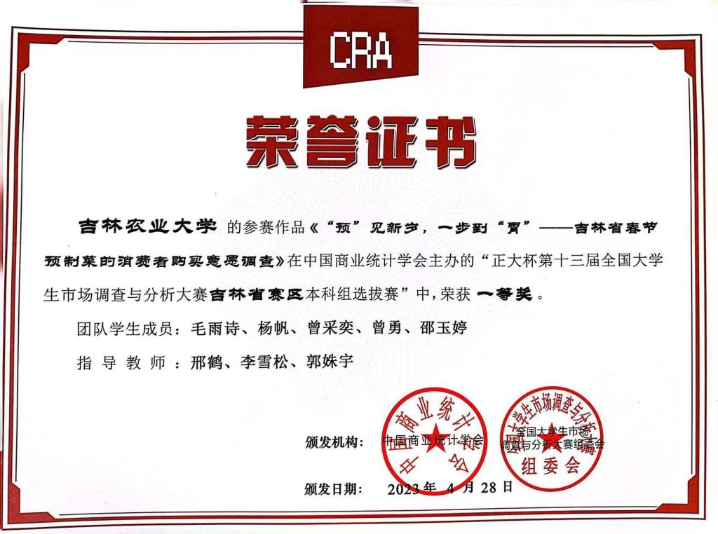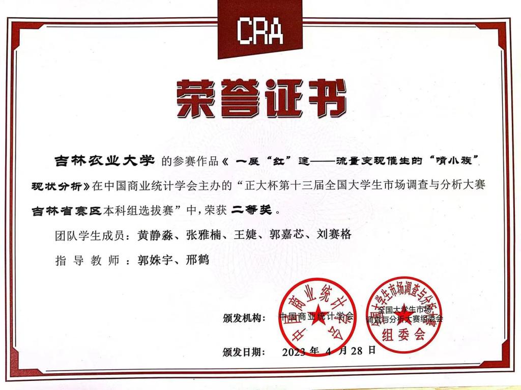 2023年5月,“正大杯”第十三届全国大学生市场调查与分析大赛本科组吉林省赛及全国总决赛落下帷幕。经济管理学院师生再创佳绩,参加省赛的5支队伍获得吉林省一等奖两项、二等奖两项,三等奖一项的优异成绩。从2019年至今,经济管理学院已连续五年承办“正大杯”全国大学生市场调查与分析大赛校赛,并累计获得国赛三等奖一项、吉林省一等奖七项、吉林省二等奖七项、吉林省三等奖两项。