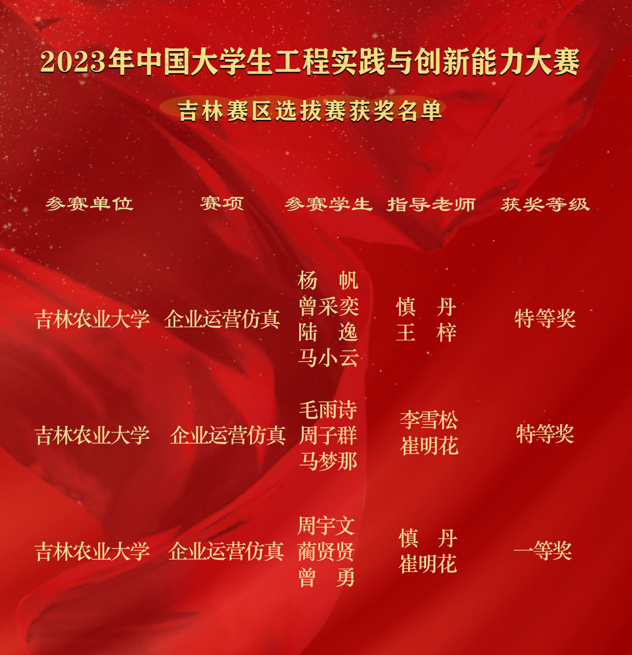 我院学生积极备赛,共选派3支队伍代表学校参加了吉林省选拔赛,并从全省的22所高校的248支队伍、1500余名师生中脱颖而出,荣获2项特等奖、1项一等奖的优异成绩,并代表吉林省晋级全国总决赛,斩获了国赛铜奖的历史最佳成绩,实现了该赛事在我校的历史性突破,充分展示了我院学子不断突破、向上攀登的拼搏精神和青春风采。
