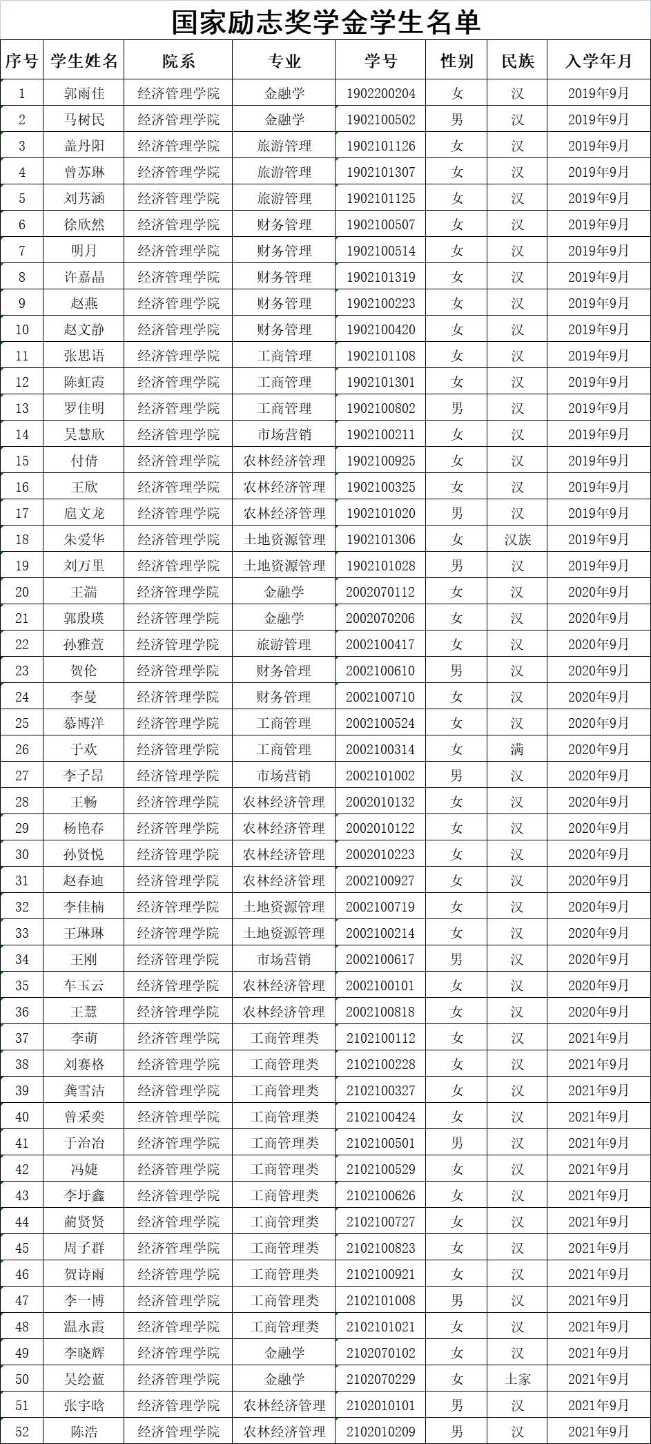 国家励志奖学金学生名单